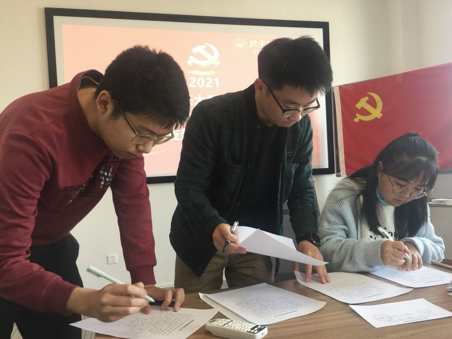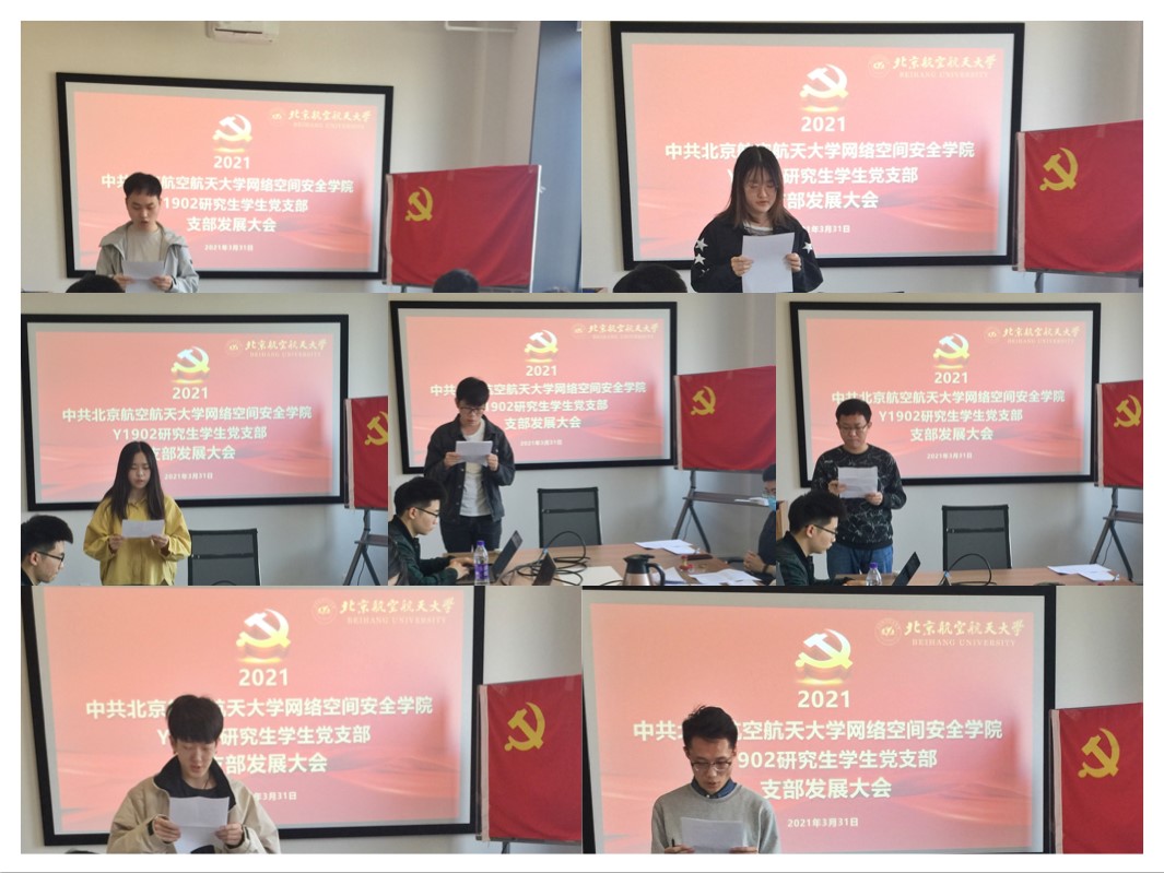 2021年3月31日上午10时,北航网络空间安全学院Y1902学生党支部在一号馆408会议室召开支部党员发展大会,讨论能否接收曹银浩、韩祎然、刘翔宇、魏晨光、吴礼金、张伟豪、王庆麟7名同志为中共预备党员。本次大会由党支部书记陈晨主持,党建特邀组织员邓彦敏老师、专职组织员王倩云老师、专职辅导员杜逸雯老师列席本次会议。支部党员应到5人,实到5人。