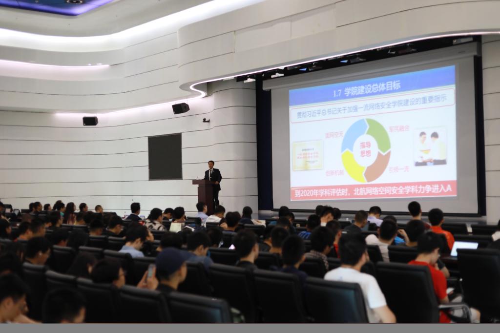 5月5日下午,在沙河校区主楼四楼报告厅,网络空间安全学院组织了专业宣讲会。学院院长兼党委书记刘建伟出席会议并讲话,学院副院长伍前红、党委副书记祝贺、本科教学负责人徐同阁等11位学院领导、老师以及2018级信息大类近200名学生参加了本次活动。刘建伟教授从网络空间安全学院简介、发展规划、专业设置与培养方案、学科研究方向、师资队伍、毕业生就业方向等六个方面展开,进行本次的宣讲。
