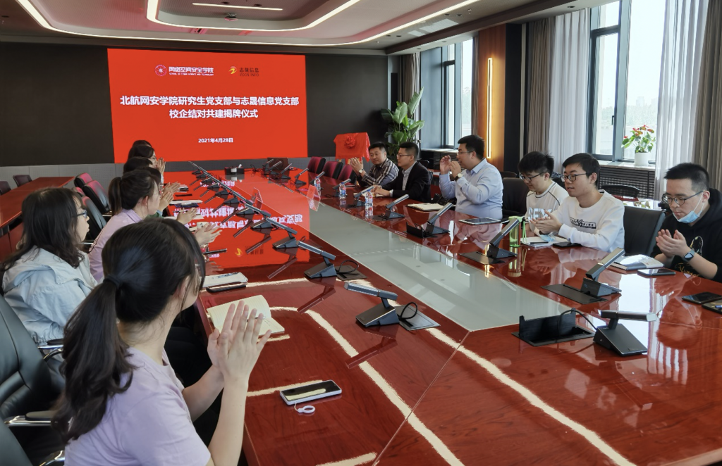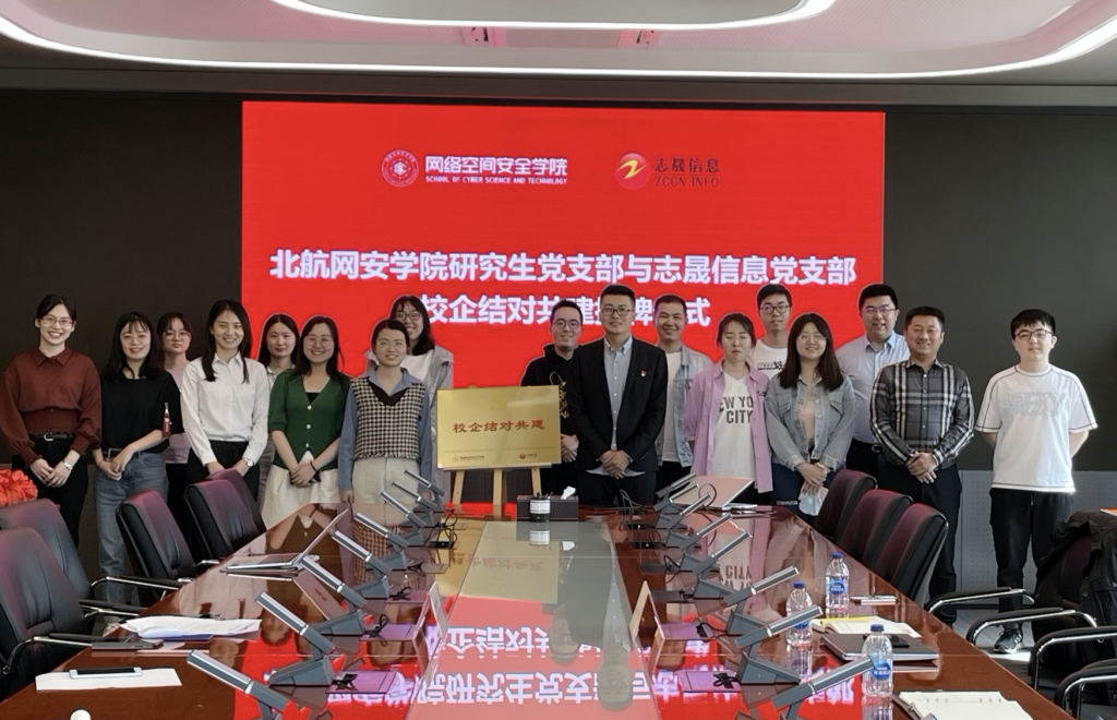 北航网安学院研究生党支部与志晟信息党支部校企结对共建揭牌仪式顺利举行,寓意着双方将在合作共建共赢的道路上越走越远!校企双方支部会牢记使命,砥砺前行,本着合作双赢、相互学习、共同进步的原则,一起把校企支部结对共建工作积极地开展下去,争取成为北航校企党支部结对共建的优秀典范。
